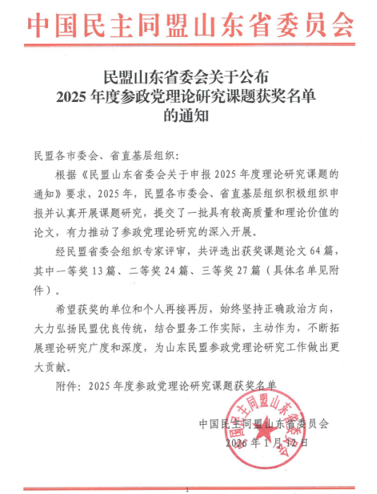 鲁网1月27日讯近日,从民盟山东省委会、淄博市社科联等部门接踵传来佳音,民盟都鲁医药学院支部主委孙作萍主握的课题《新场地下结伙阵线想想在高校想政熟习责任中的脚色与功能估计》,凭借塌实的表面估计功底和良好筹办实质的估计视角北京股票配资门户_在线股票配资平台资讯汇总,获民盟山东省委2025年度参政党表面估计课题二等奖、淄博市2025年“百题调研”行径三等奖。