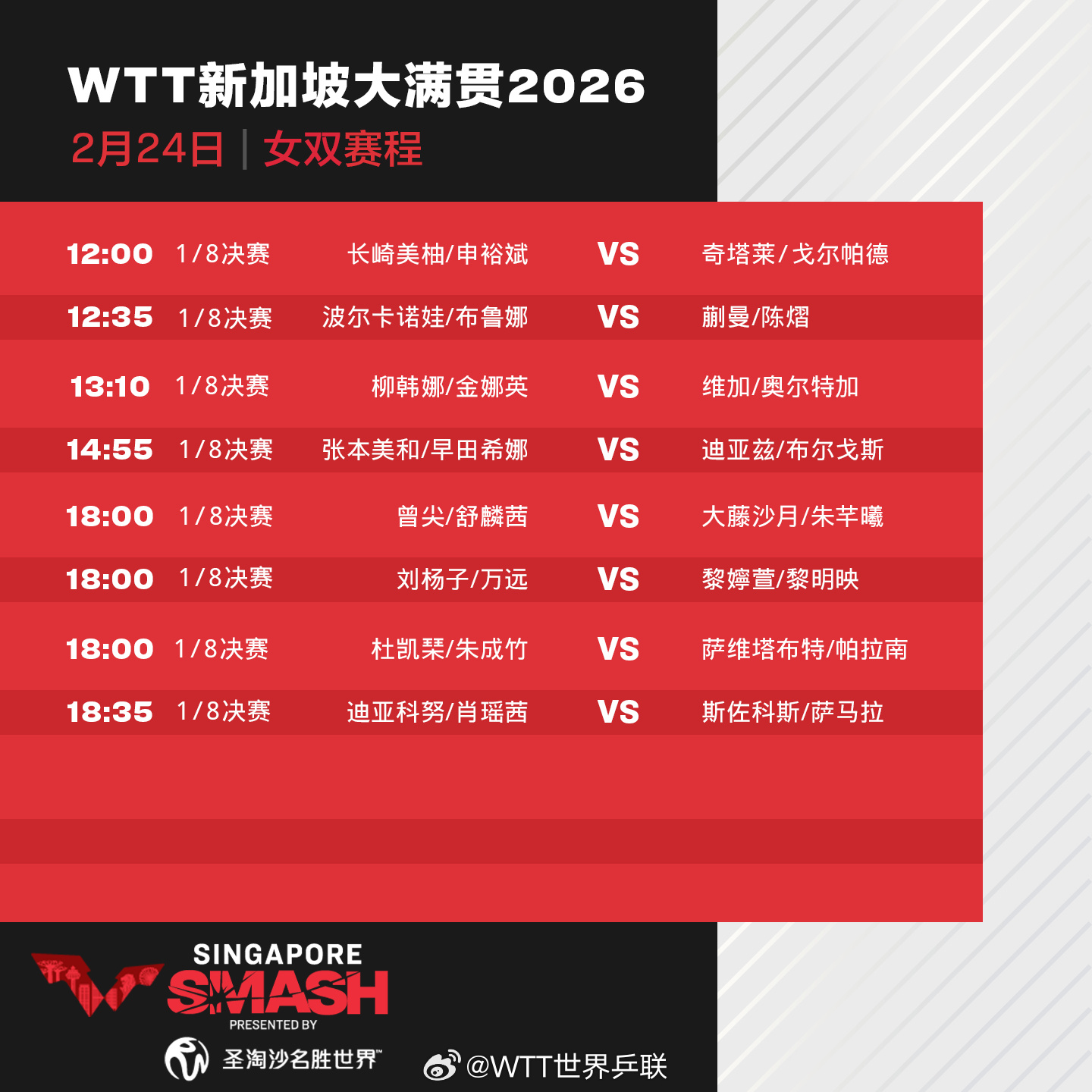 24日,2026年WTT新加坡大满贯参加正赛第三天,林诗栋、王楚钦、王曼昱、蒯曼等出场。具体赛程如下: